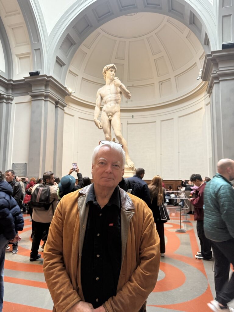 Yesterday I spent a couple of hours with Michelangelo’s David in the Galleria dell’Accademia in Florence. It is, I think, my favorite work of art in the world. I have seen it six or seven times now. It never ceases to stun me into a kind of numbness. This time the crowd size (early December) was not oppressive, as it can be with such works of art. Just try the Sistine Chapel in July if you want to know what jostling militant tourism can be. I was able to give it a full hour. The niche it is in is in itself beautiful, with a domed skylight that bathes the David in a perfect soft light. There are marble benches all around the back and sides of the 14-foot-tall statue (17 feet if you include the pedestal), and I found a chair 15 feet away directly in front of it. The sheer size is monumental, invigorating, and daunting.