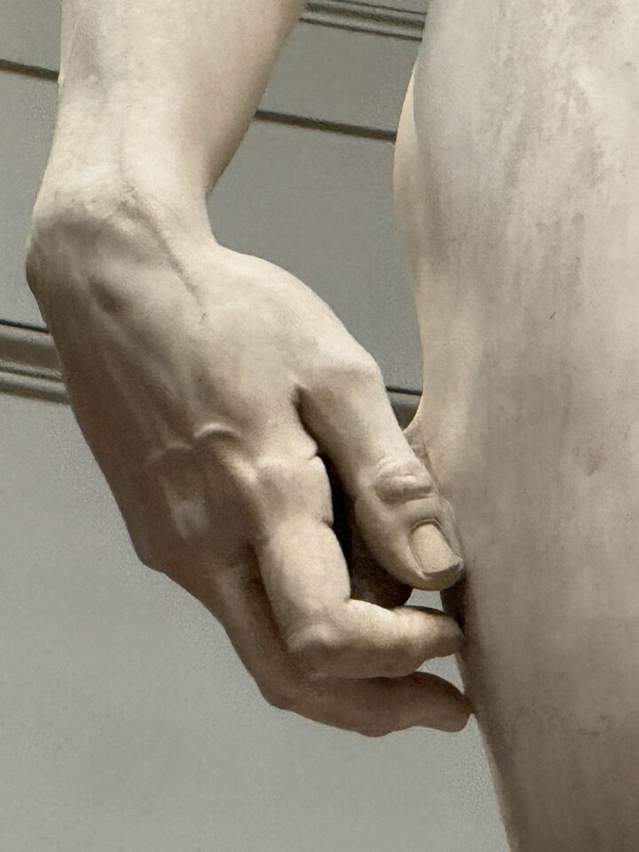 Perhaps I speak only for myself, but I know that if I had never heard of it (a cultural impossibility for almost anyone), and didn’t know the name of the sculptor, I would never walk by it without exclaiming, probably out loud, “This is one of the most beautiful things I have ever seen.” Anatomists who have studied it millimeter by millimeter have said that it is essentially perfect in all of its magnificent detail, the head may be a smidgeon too large, and several veins and tendons in his right hand are perhaps not quite flawless. But hey … who’s quibbling?