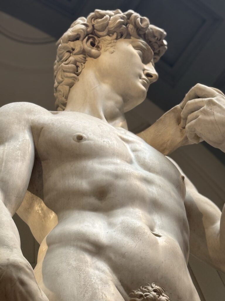 As I sat there, 4,930 miles from home, I tried to be fully present (there! gazing at this work of art! drinking in all of its detail from his curly head of hair down to his exquisite ankles and toes). I took a hundred or more photographs of it from every angle, zooming in on every detail that interested me. I could have spent the whole day there. In my view, you don’t need to “privilege” the David to know that it belongs at the top of the list, a list that includes the Sphinx at Cairo, Bernini’s Apollo and Daphne, Michelangelo’s Pieta at St. Peter’s in Rome, Rodin’s The Thinker, the Moai statues at Easter Island, the Venus de Milo at the Louvre, among others.