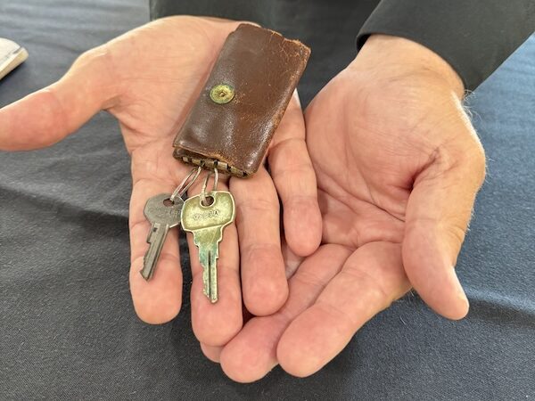 Clay holding the keys to John Steinbeck’s Rocinante at the National Steinbeck Center archives.